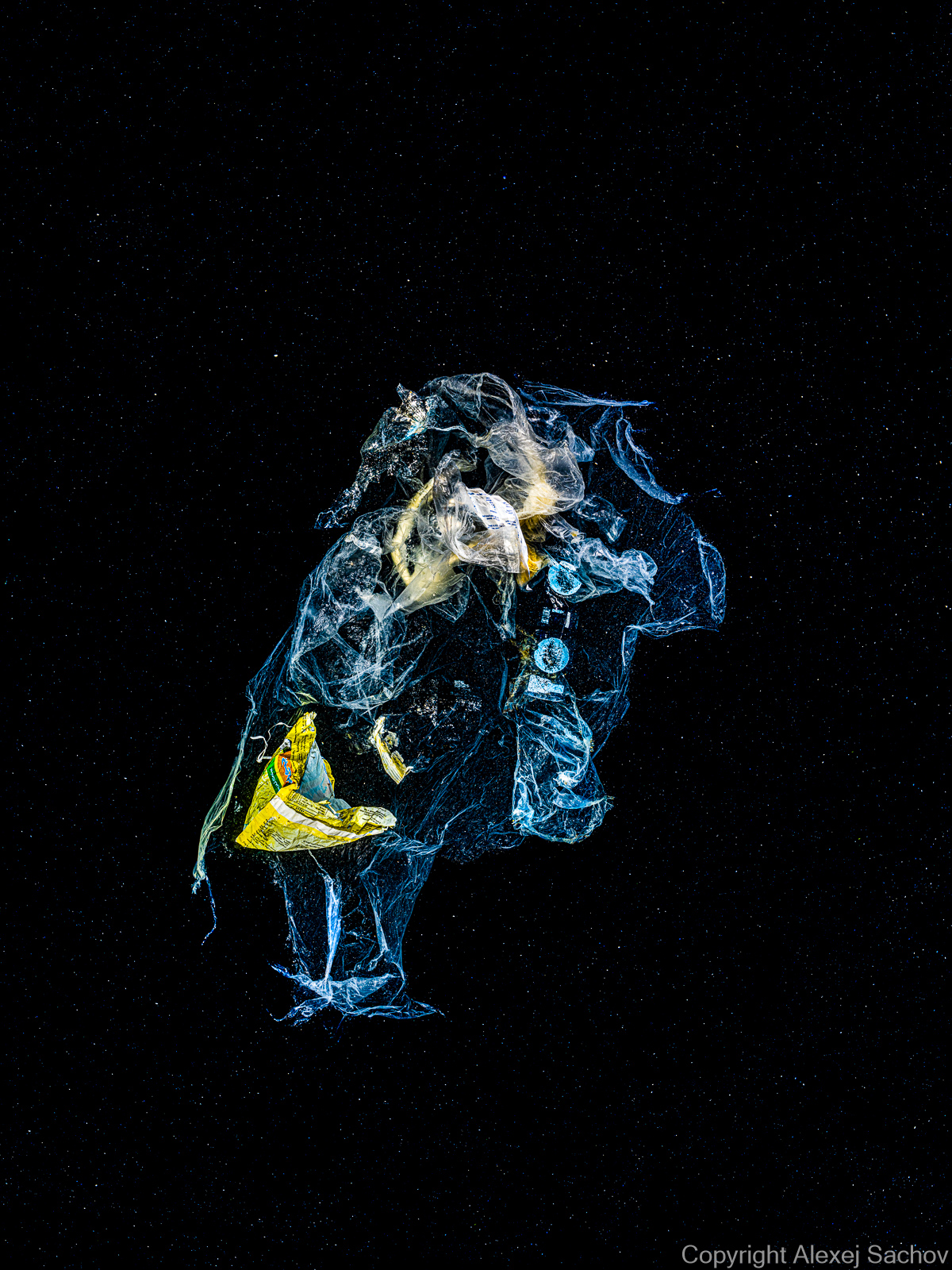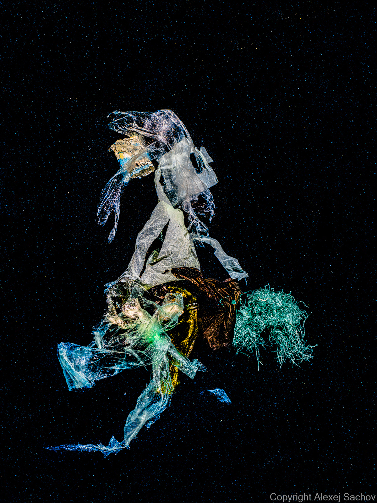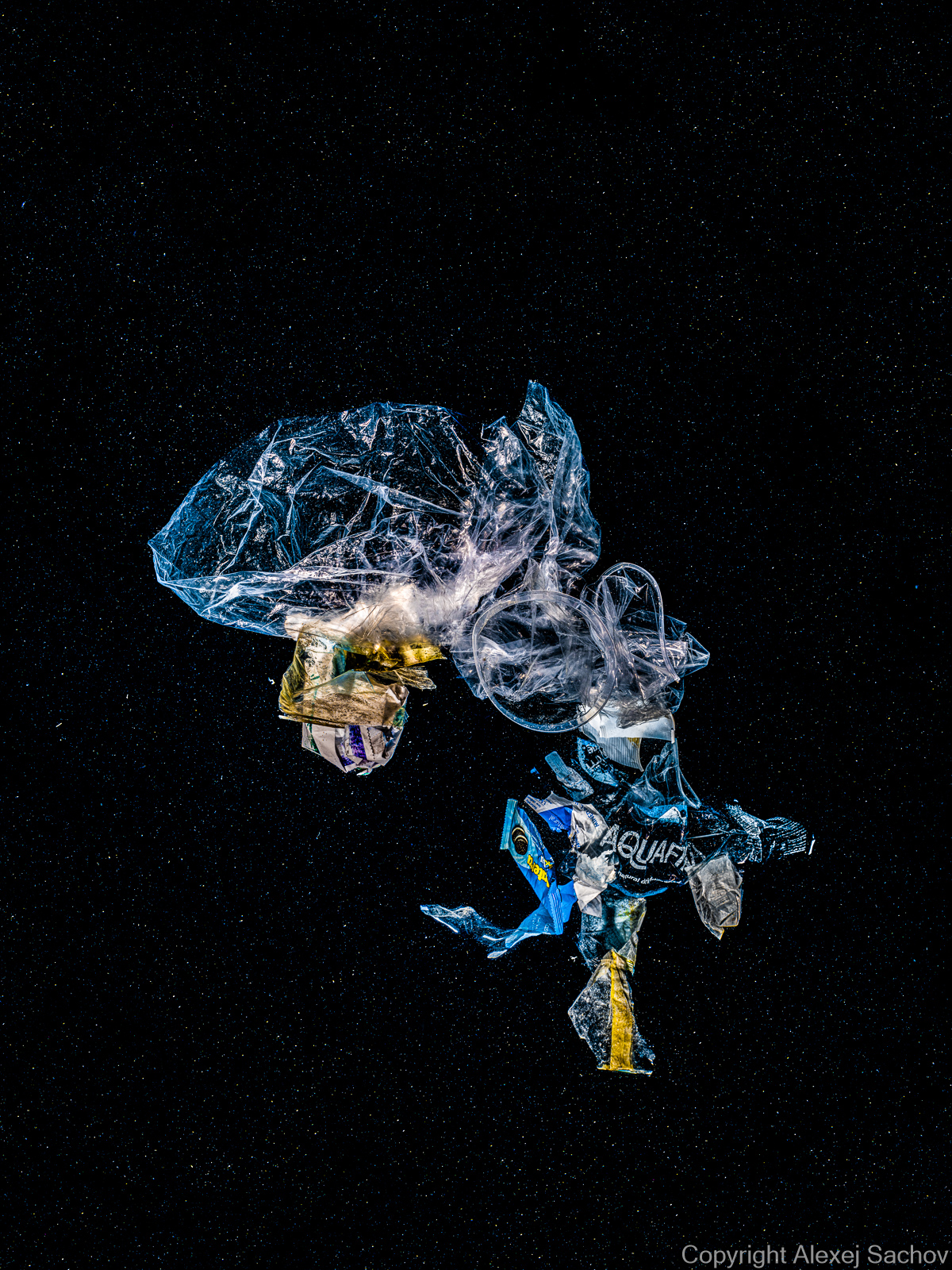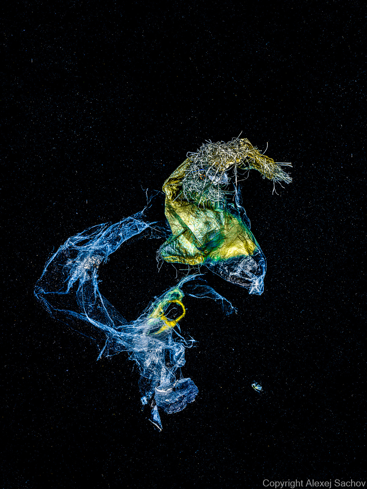 The species, captured in the weightlessness of the underwater cosmos, are the result of chance collisions of plastic bags, cups, bottles, nets, and jars gathered during two-hour-long scuba dives. Like most scuba divers, Alexej fights against pollution by collecting trash underwater. At the end of his dives, he takes pictures of the collected trash and removes it from the water for proper disposal.