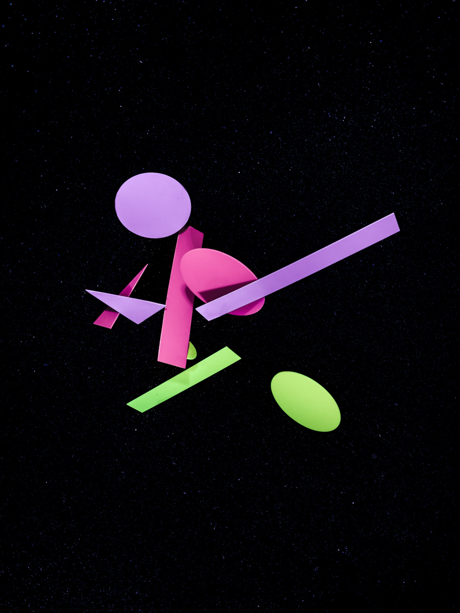 world.” Here, we see fluorescent shapes – triangles, circles and rectangles – floating in a